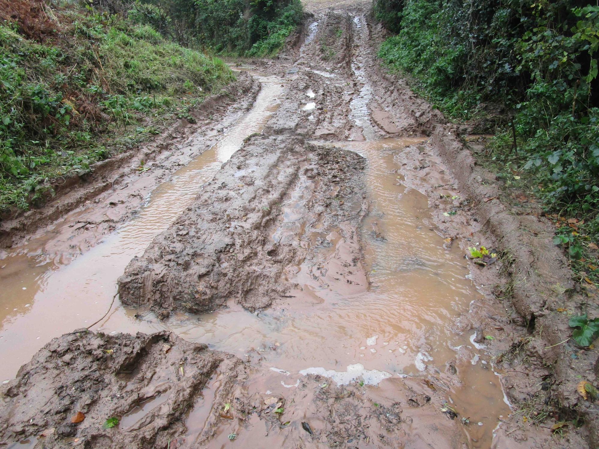 Soil runoff through rutted gateway from Maize & root-crop farming resulting in soil erosion and village flooding |